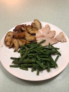 For lunch, my husband and I split the Roasted Turkey with red potato wedges and broccoli. We loved it! The turkey was especially good and was seasoned well. The green beans were bright green and fresh. They were firm and not mushy. The seasoning on the potatoes was perfect. 4 minutes in the microwave cooked it to just the right temperature. The shrink wrap is self-venting and forms a steam bubble which leaves the food hot and juicy. I removed the food from the carton and put it on a 10-inch plate to get a real idea of how much food there was in a 4 oz meal.