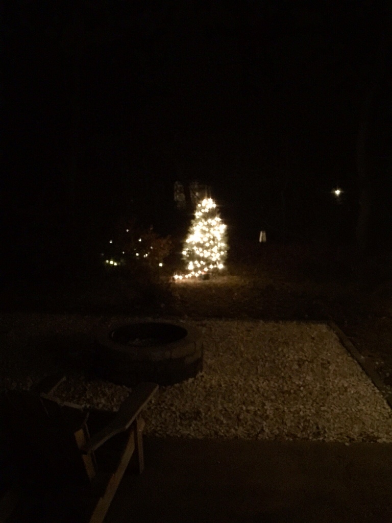We buy the big tree and hurry home. Now comes the extensive spraying and cleaning and steam mopping after removing the old tree. We decided not to take the lights off of it to minimize any more creatures dropping out of it. Husband had a good idea. He said, “Since it has lights on it, let's just put it outside and plug it in.” I was happy with that idea – I loved this little tree and wasn't ready to let it go.